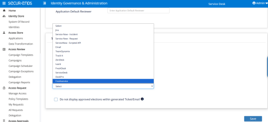 Freshservice: Freshservice can now be used as the ticketing system for access reviews. After adding the application details and selecting the ticketing system, you will see Freshservice available as an option.